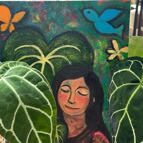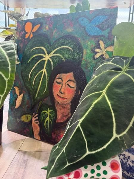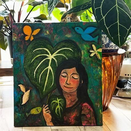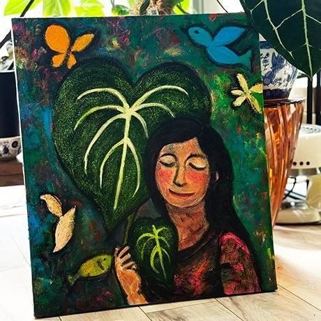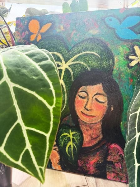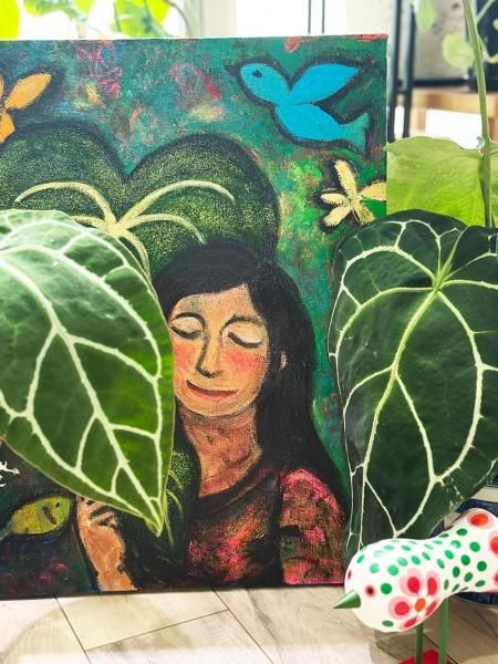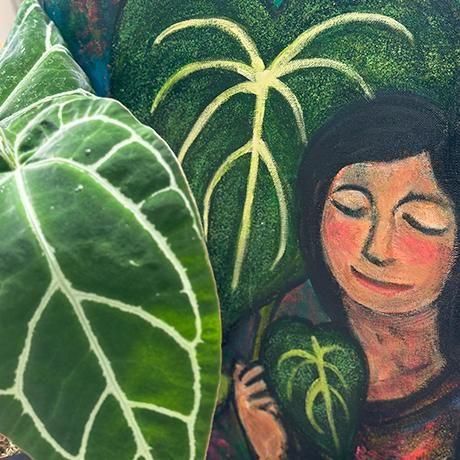 アンスリウムを抱く女性を通じて、“宇宙の愛と光の波動”を映し出した作品です。 アンスリウムのハート型は、無条件の愛・繁栄・調和を象徴し、持つ人や空間に高次のエネルギーを流れ込ませるゲートの役割を果たします。