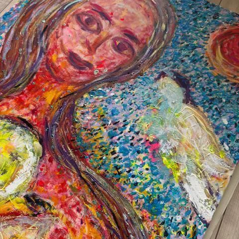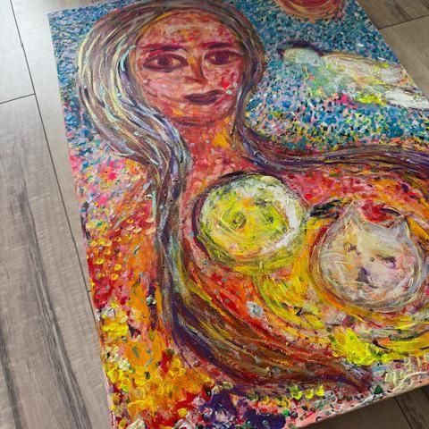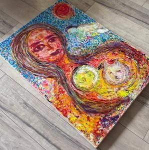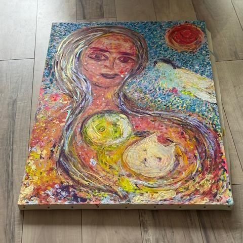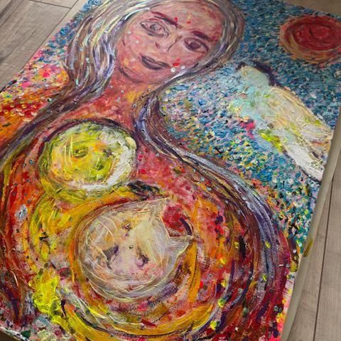 中央に浮かび上がる女性像は、身体性を超えて、人類の集合的無意識に刻印されたアルケー=始源の存在としての「母」を具現化しています。 その眼差しは、観者を見つめると同時に、観者の深層を反射する内的視線(inner gaze)として作用し、絵画と観る者の間に多層的な対話構造を生み出します。