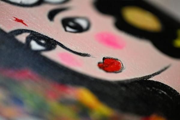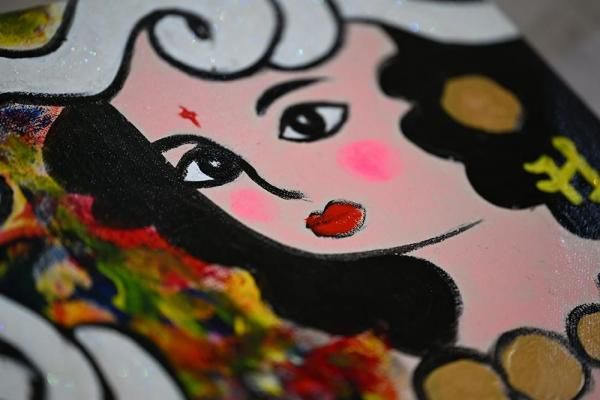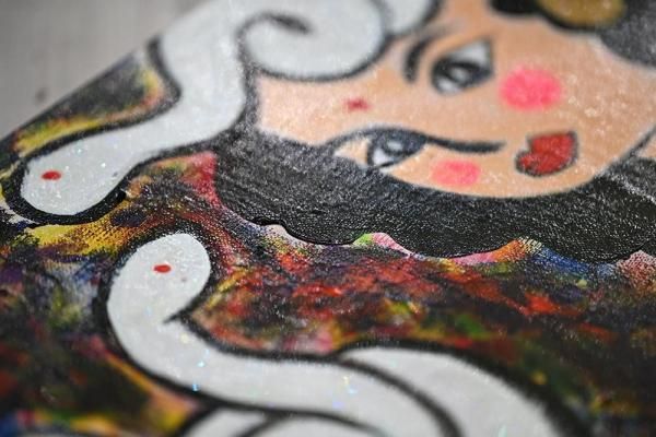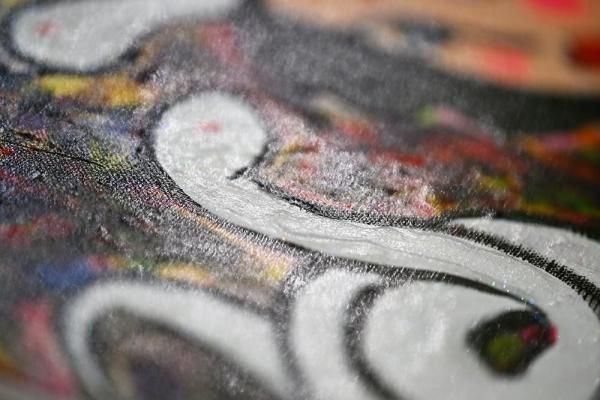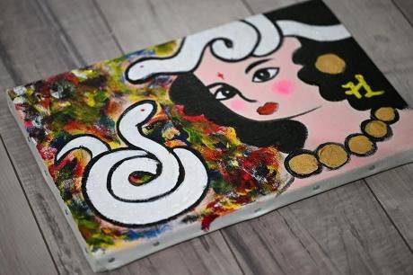 背景にはカラフルな抽象表現を取り入れ、華やかさと神秘性を演出。白蛇の部分にはきらめくラメを使用しており、角度によって美しく光を反射します。